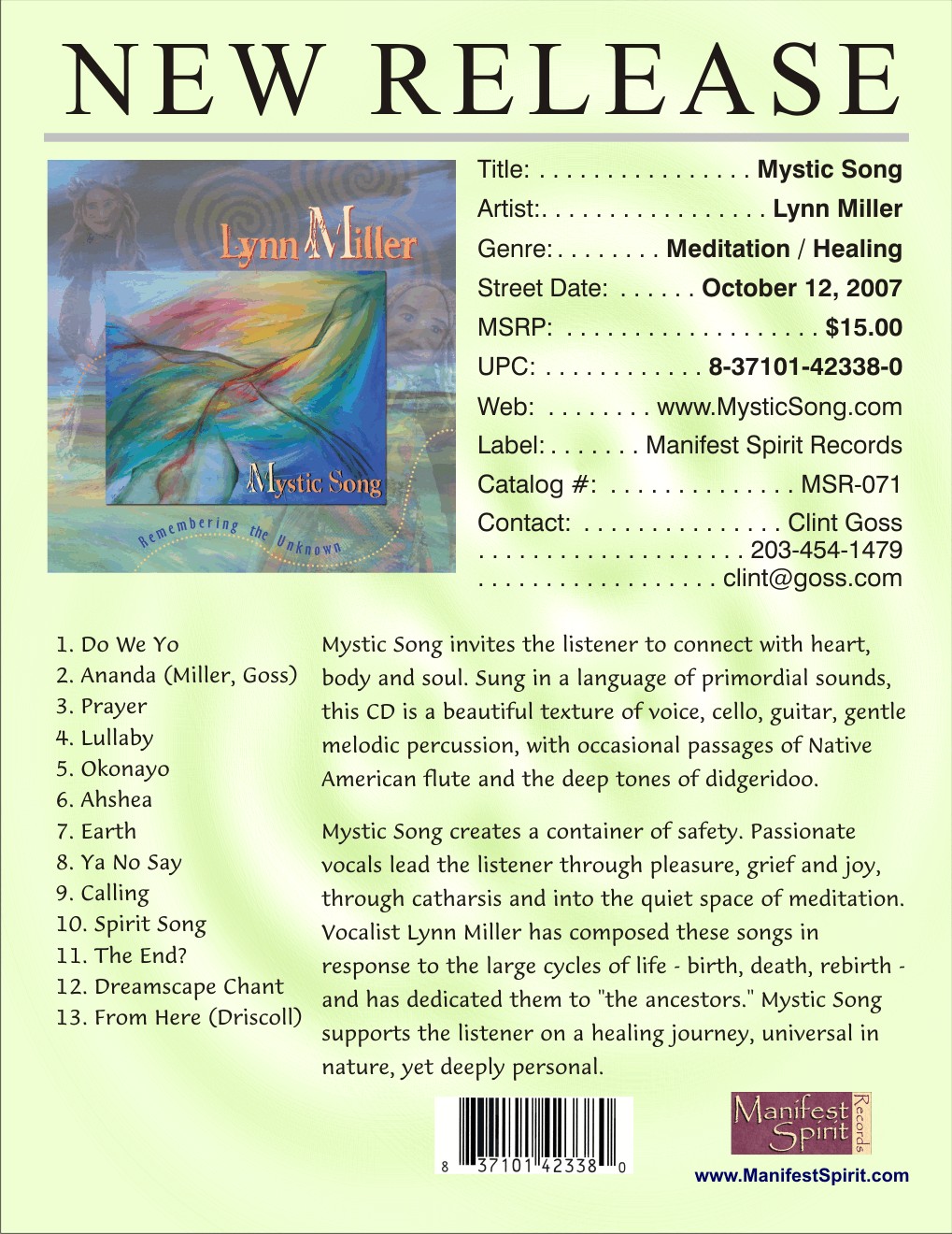 Mystic Song invites the listener to connect with heart, body and soul. Sung in a language of primordial sounds, this CD is a beautiful texture of voice, cello, guitar, gentle melodic percussion, with occasional passages of Native American flute and the deep tones of didgeridoo. Mystic Song creates a container of safety. Passionate vocals lead the listener through pleasure, grief and joy, through catharsis and into the quiet space of meditation. Vocalist Lynn Miller has composed these songs in response to the large cycles of life - birth, death, rebirth - and has dedicated them to "the ancestors." Mystic Song supports the listener on a healing journey, universal in nature, yet deeply personal. ReviewsMystical and Sensual Sounds … Lynn Miller invites the listener to connect with heart, body, and soul to take in the sounds, language, and emotions of her voice. The tones that emerge through her are sensual, haunting, and profoundly familiar. The prayerful selection #7, Earth, is exceptional. Mystic Song reminds us that cultures blend and language is more that vocabulary. We ultimately communicate through energy, emotion, and meaning that springs from our spirits. -- Elizabeth Frediani, Pennsylvania, October 13, 2007