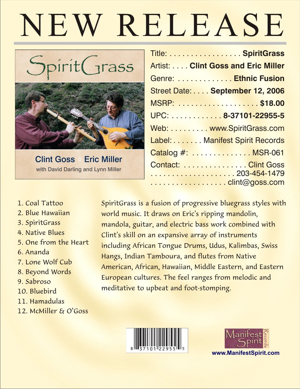DescriptionSpiritGrass is a unique collaboration between the renowned jazz and bluegrass artist Eric Miller and world instrument troubadour Clint Goss. Eric and Clint connected at a chance "in the moment" improvisation at a performance in the summer of 2005. They combined Mandolin with a Slovakian Koncovka flute. The music that emerged, as well as the standing ovation, told them they were on to something. So they began exploring combinations of instruments and motifs, expanding bluegrass traditions in new directions. The SpiritGrass CD is a fusion of progressive bluegrass styles with world music. It draws on Eric's ripping mandolin, mandola, guitar, and electric bass work combined with Clint's skill on an expansive array of instruments including African Tongue Drums, Udus, Kalimbas, Swiss Hangs, Indian Tamboura, and flutes from Native American, African, Hawaiian, Middle Eastern, and Eastern European cultures. The feel ranges from melodic and meditative to upbeat and foot-stomping. While Clint and Eric form the core of SpiritGrass, they have brought in "friends and family" to round out the CD. Various tracks include David Darling on cello, Lynn Miller on vocals, and Randy Brody and Vera Shanov on percussion. ReviewsAn improvisational jaunt through World Bluegrass and exotic instruments with the highest caliber musicians. Clint Goss and Eric Miller's musical conversations on this CD are one's of trust and respect. It shows. From Coal Tatoo to McMiller and O'Goss the toe-tapping George Harrison influenced Guitar, Mandolin and Mandola of Miller balances perfectly with the World Flutes and exotic percussion of Goss. Both are accomplished at what they do, but not so much they don't forget to have a load of fun. You will too. Highlights are Native Blues, a no apologies simply rocking groove! Ananda, Lone Wolf Cub and Beyond Words are stunning beauties with Hang drum and vocals. These are musicians at the level of the best jazz, bluegrass or native flute contemporaries and this CD, Spirit Grass, should not be missed. -- Randy Granger, www.RandyGranger.net